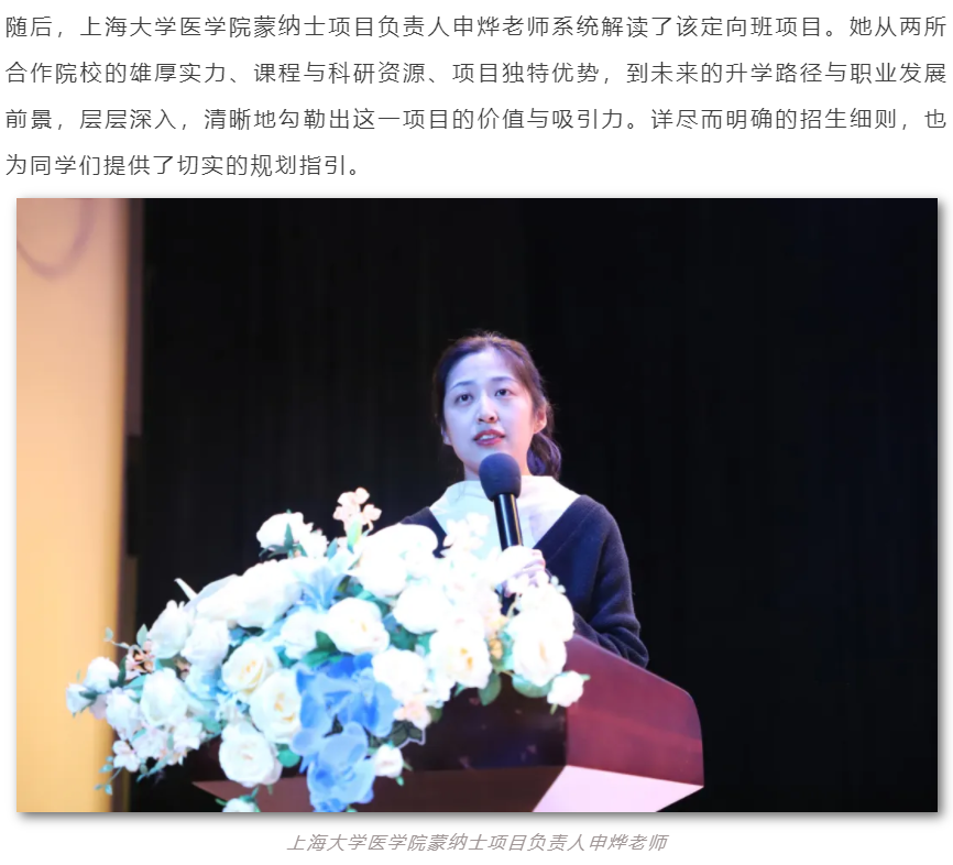 在宣讲环节中,来自上海大学医学院的项目负责人申烨老师系统而清晰地勾勒出该项目的全貌。而在宣讲会开始前,我们也与申老师进行了交流。她从项目设计者的角度,进一步分享了这一“黄金路径”的设立初衷与核心优势: