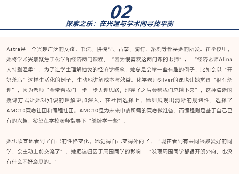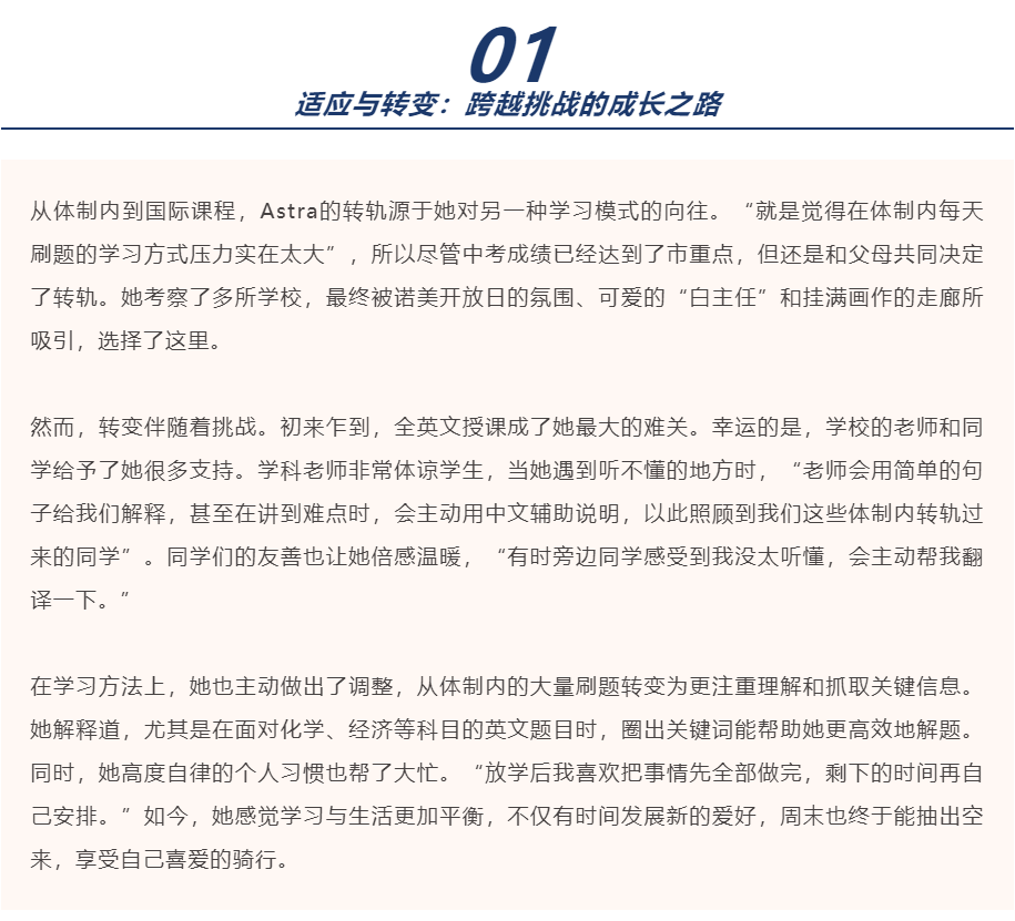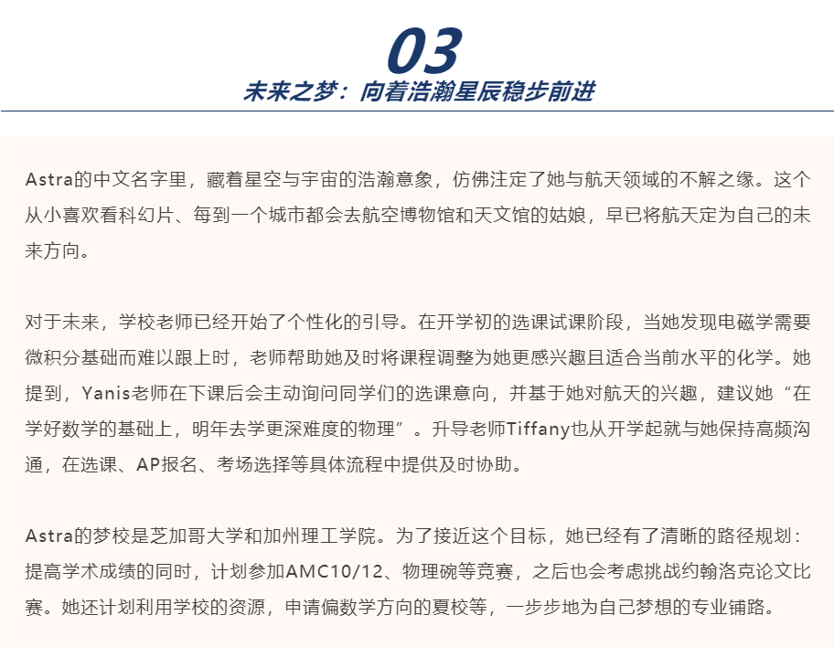 从最初面对全英文授课的忐忑,到如今在课堂里游刃有余;从按部就班的刷题模式,到自主规划时间、发展兴趣——Astra的每一步跨越,都见证着勇气与智慧。相信怀揣航天梦想的她,必将在未来的星辰大海中,找到属于自己的轨道,绽放独特的光芒。