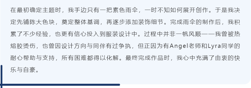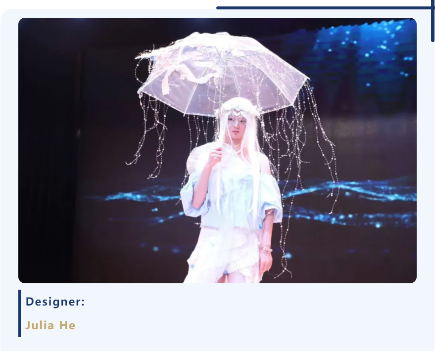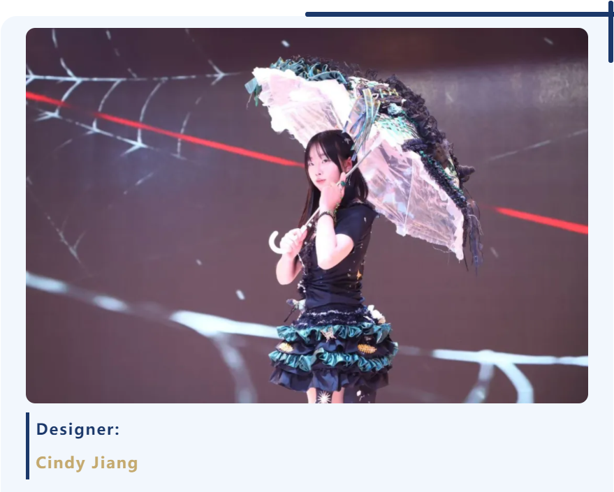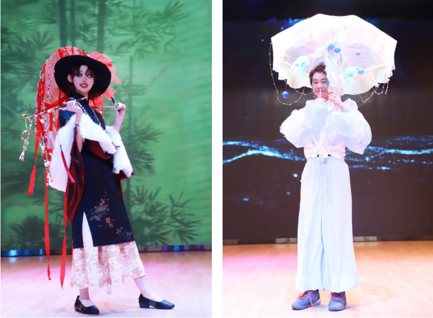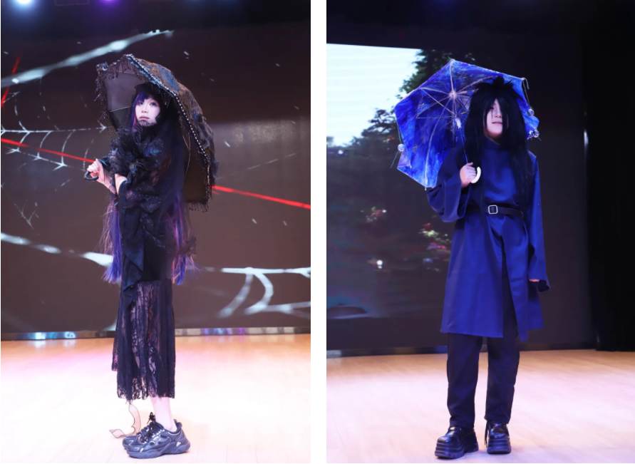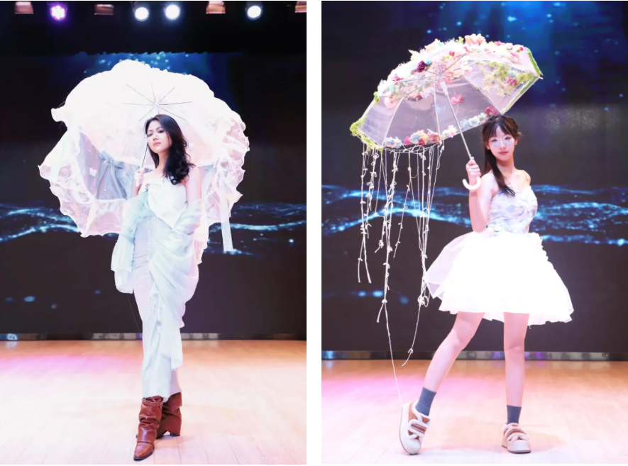 在这里,伞不再是遮雨的工具,而成为艺术流动的骨骼——它化作深海中翻涌的蓝纱,变为哥特穹顶下摇曳的暗影,生长为森林里缠绕藤蔓的枝桠,又染上民族衣袍上的古老纹样。每一把伞、每一件服饰,都承载着同学们独特的视角与丰富的创造力。
