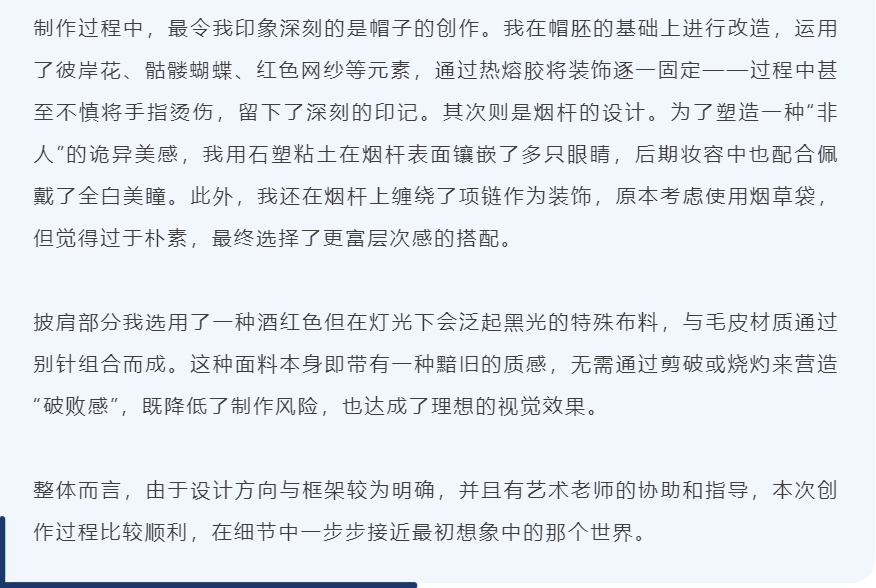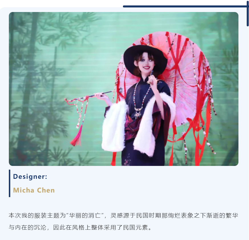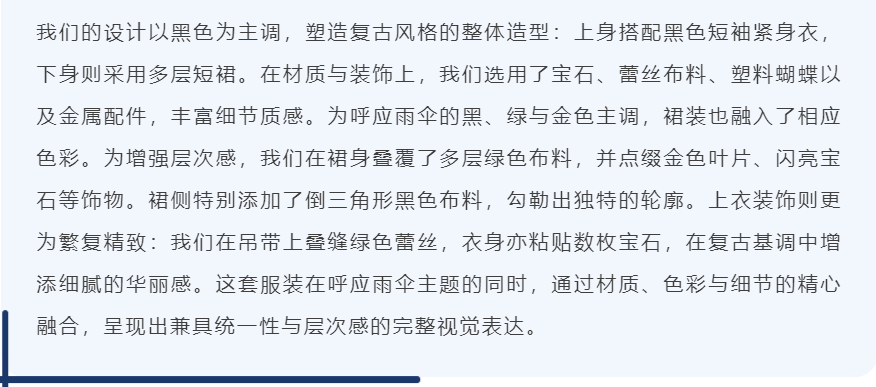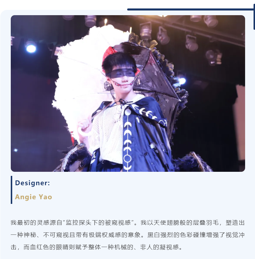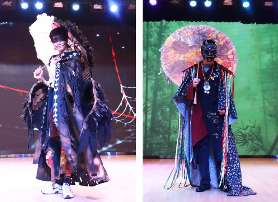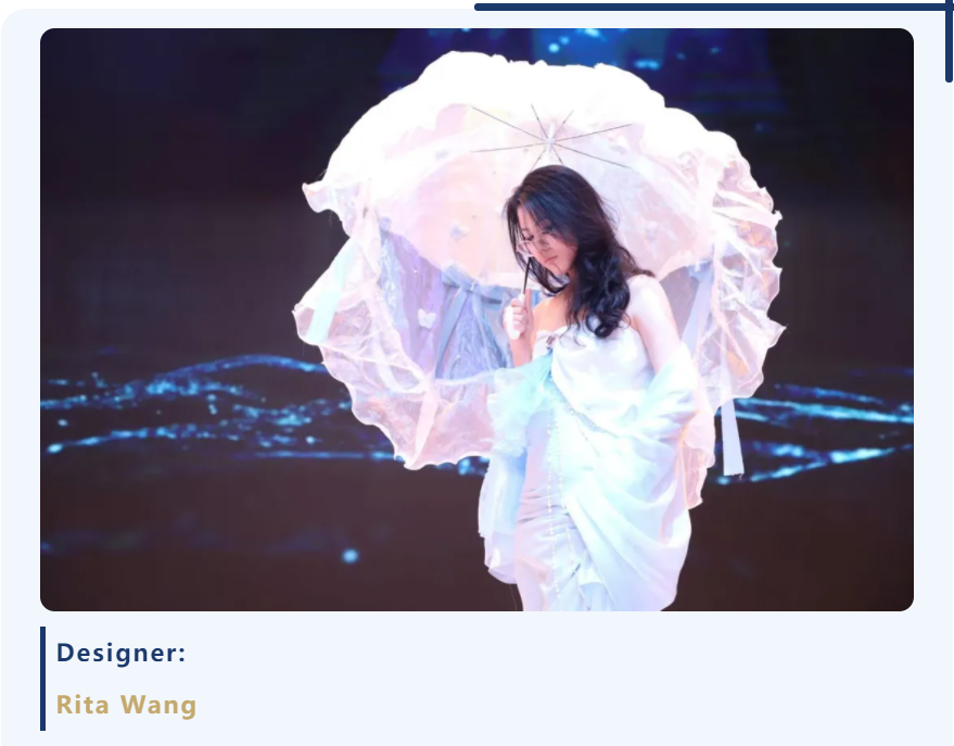 在这里,伞不再是遮雨的工具,而成为艺术流动的骨骼——它化作深海中翻涌的蓝纱,变为哥特穹顶下摇曳的暗影,生长为森林里缠绕藤蔓的枝桠,又染上民族衣袍上的古老纹样。每一把伞、每一件服饰,都承载着同学们独特的视角与丰富的创造力。