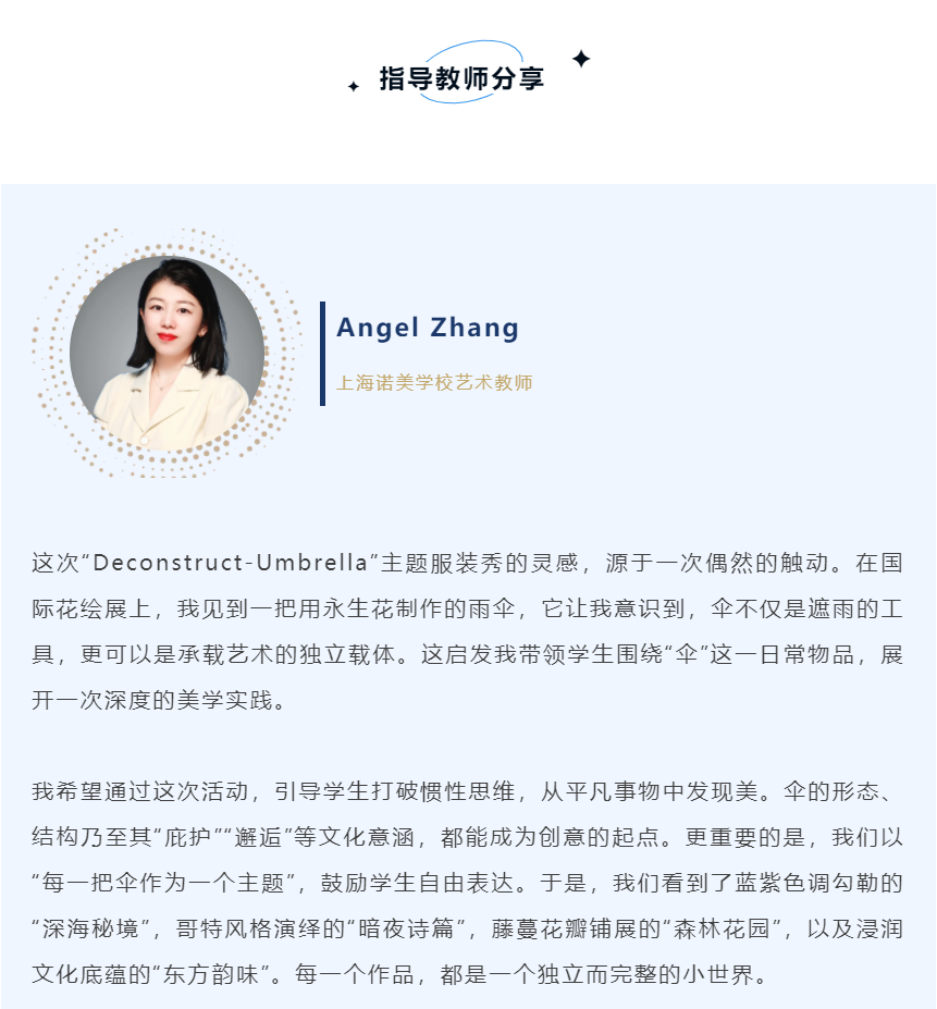 近日,我校艺术组师生成功举办了一场别开生面的“Deconstruct-Umbrella”主题服装秀。T台之上,伞超越了其原本的功能,化身艺术的载体与创意的核心。