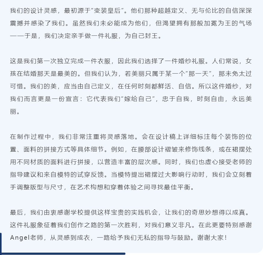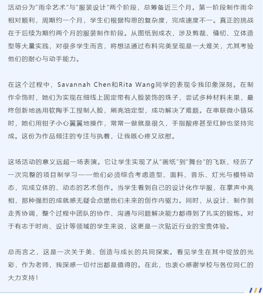 这场以伞为起点、以创意为翅膀的服装秀,不仅是一场视觉的盛宴,更是一次生动的成长课。我们见证了平凡物品如何被赋予艺术的灵魂,也见证了同学们如何将灵感的微光,淬炼成舞台上璀璨的具象。活动虽已落幕,但美与创造的种子,已然在同学们心中生根发芽。让我们共同期待,下一次更为绚烂的绽放。