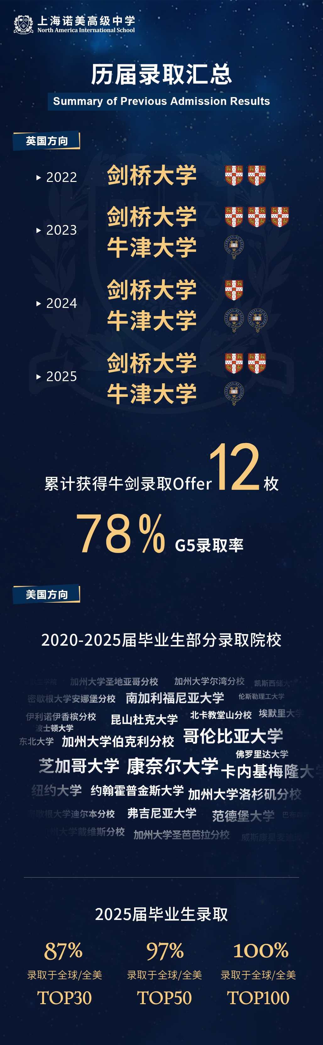 我校已连续四年收获牛津、剑桥大学的录取,累计已获12枚牛剑Offer,英国G5超级精英大学的整体录取率达到78%。历届学子不仅多次斩获包括牛津、剑桥、帝国理工等英国G5名校,以及哥伦比亚大学、康奈尔大学等常春藤盟校的录取,也广受芝加哥大学、约翰霍普金斯大学、加州大学伯克利分校、洛杉矶分校、范德堡大学、圣路易斯华盛顿大学、卡内基梅隆大学、南加州大学、纽约大学、弗吉尼亚大学、密歇根安娜堡分校、墨尔本大学、多伦多大学、LSE、UCL、伦敦国王学院、爱丁堡、香港大学、悉尼大学、麦吉尔大学、东京大学、早稻田等世界顶尖院校的青睐。
