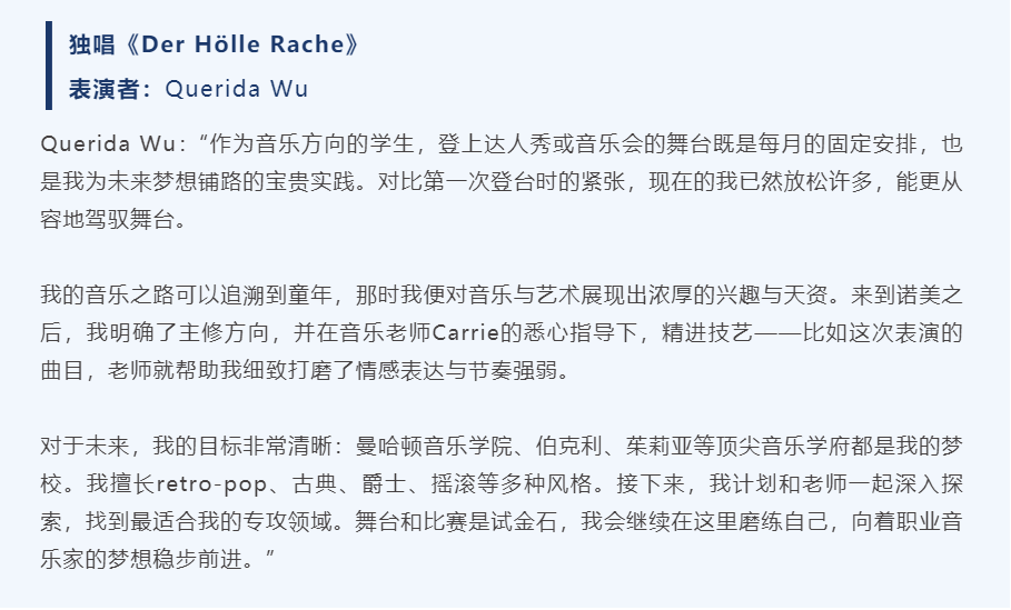 近日,本学期首场诺美达人秀火热上演,24组怀揣才艺与梦想的学子轮番登场,用歌声、舞步和旋律点燃了整个秋夜。现场掌声雷动,欢呼声此起彼伏,共同见证了一场青春洋溢的视听盛宴。本次达人秀节目类型丰富多元,从深情款款的独唱、默契十足的合唱,到技艺精湛的乐器演奏(如钢琴、大提琴、架子鼓等);从活力四射的流行歌舞、个性张扬的说唱,到难度颇高的歌剧片段……同学们在舞台上尽情释放自我,展现了诺美学子课堂之外的多彩风貌和自信风采。